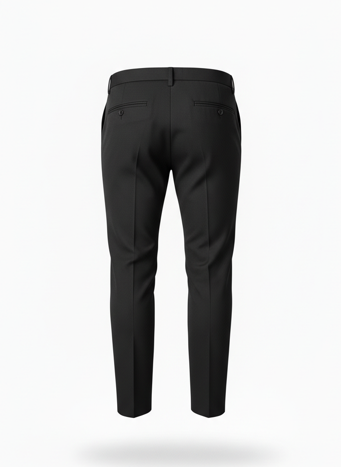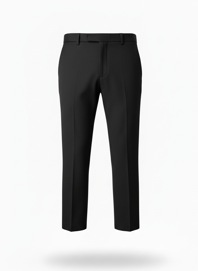 These pants have a tapered leg layout in a black color. The fabric is a polyester-based blend that provides a flat texture, and the front has a standard zipper closure. It has a simple four-pocket layout for basic storage.