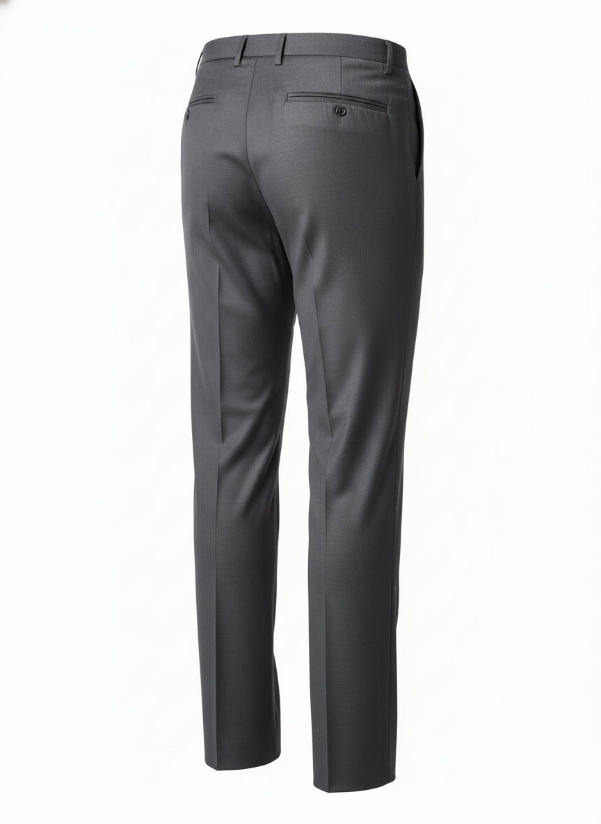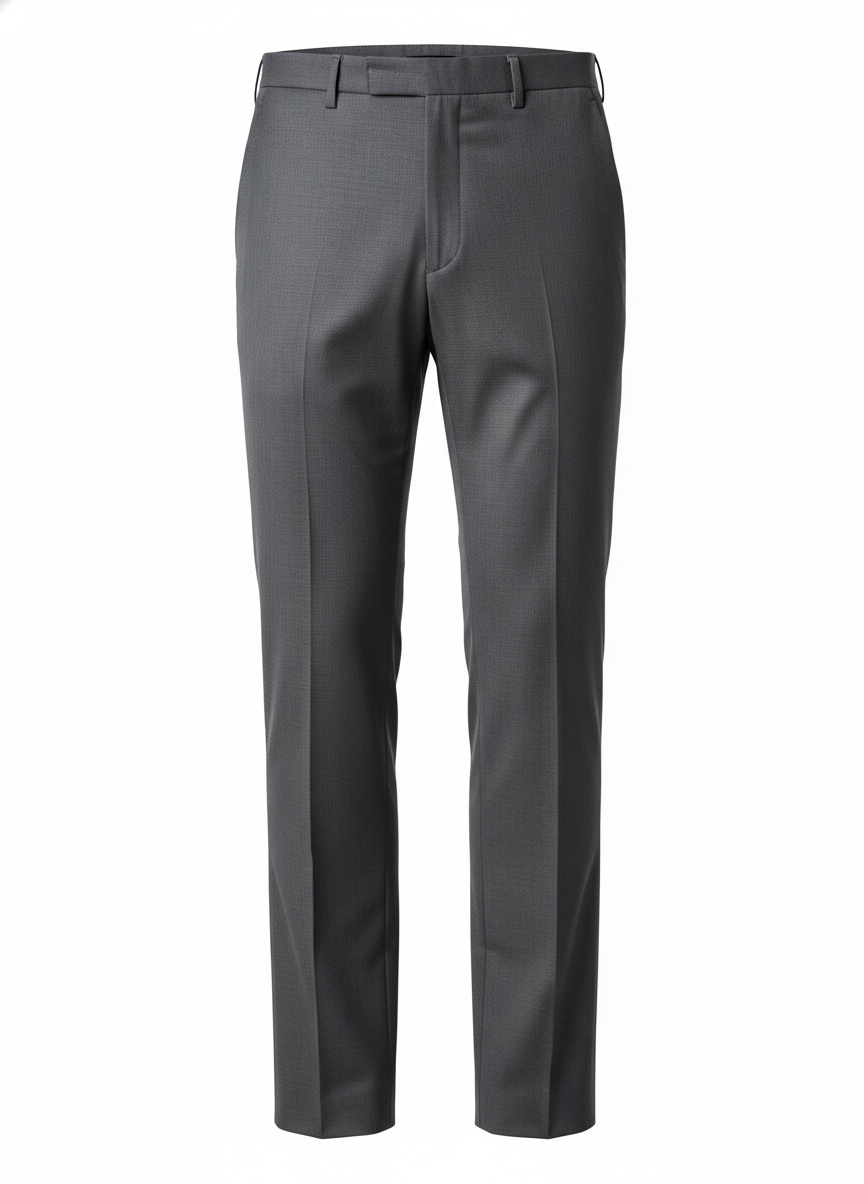 These trousers have a simple flat-front layout in a gray tone. The fabric is a synthetic polyester blend that keeps a pressed look, and the pockets are basic in size. It has a standard waist closure and internal stitching for a clean look.